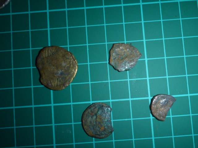 Die erste der drei Münzen aus Bronze könnte ein As sein, aber genau kann ich es nicht sagen.