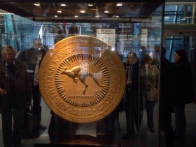 dieses Bild habe ich in einer Bank in einer belebten Einkaufsstrasse vor ca. 3 Jahren gemacht. Das "Münzlein" hat sage und schreibe 1000 KG und so einen Durchmesser von ca. 1 Meter + / -. Ist aber auch schön hoch, wenn man sie auf den Boden legt. Damaliger Wert war ca. 33.000.000,- Euro. Made in Down Under; haben wohl noch zu viel gelbes Edelmetall dort. pardon