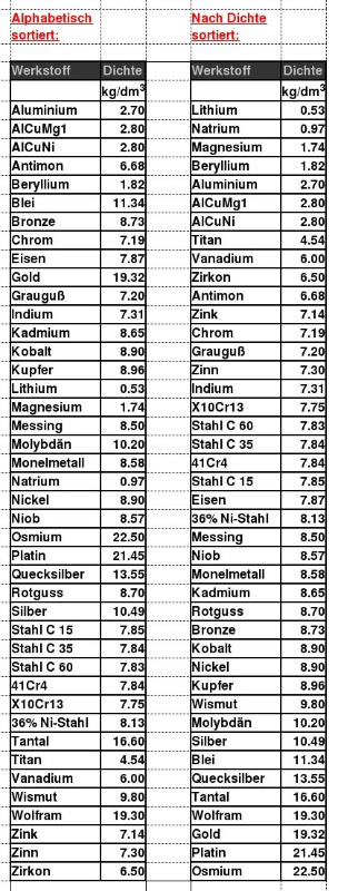 Der Gegenstand muß metallisch rein sein, es dürfen keine Anhaftungen wie Schmutz oder Patina dran haften (verringert die Dichte), was bei unserem Hobby natürlich alltäglich ist. Trotzdem, als Anhaltswert für das ein oder andere doch gut zu gebrauchen.