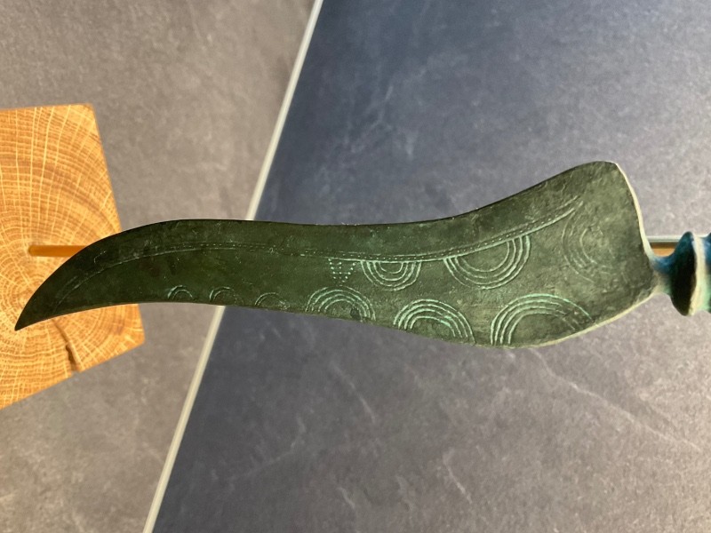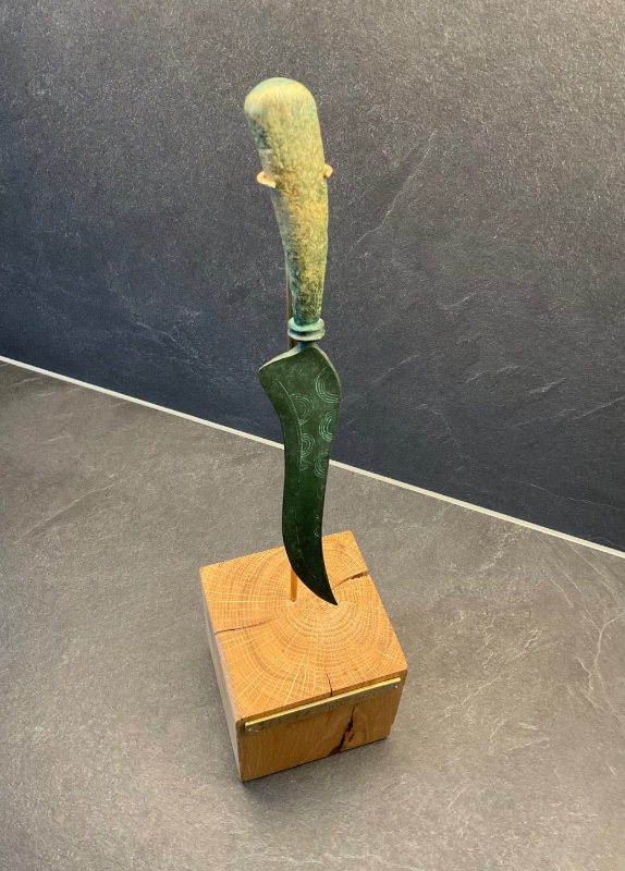 - Ein handgefertigtes und graviertes Sockelschild rundet das Bronzezeitliche Messer ab.