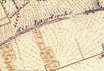 Habe dann zuhause recherchiert und diese alte Karte gefunden. Diese "Landwehr" verläuft genau längs über diese Wiese. Allerdings kann ich mir da nichts drunter vorstellen. Jemand eine Idee?